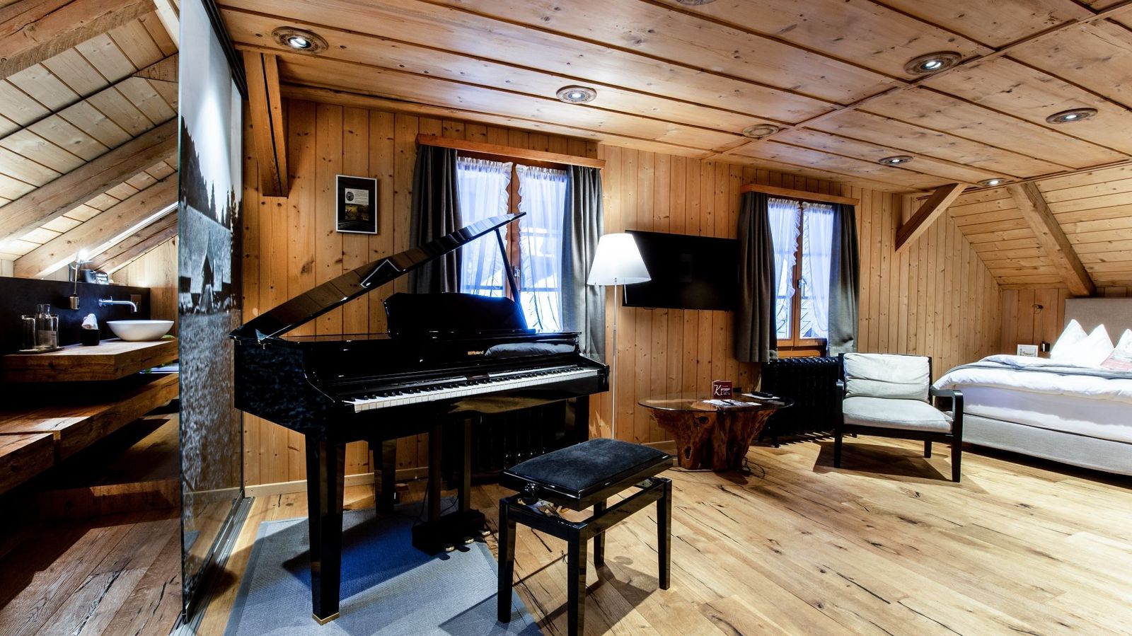 Unser Chef, ein passionierter Klavierspieler, versuchte also ein Hotelzimmer mit einem Klavier zu buchen – vergeblich. Im Kemmeriboden-Team gibt es viele musikbegeisterte Mitarbeitende, so auch unser Nachwuchs-Jazz-Pianist Dario (ehemaliger Lehrling). Dieser vermittelte schliesslich den Kontakt zu Krompholz, einem traditionsreichen Musikhaus mit ähnlicher Unternehmensphilosophie wie das Kemmeriboden Bad. Gemeinsam wurde das einmalige Konzept der Klavierzimmer ausgearbeitet. Sowohl die Zimmer Ämmezimmer, Heugade 1878 und Schlafen im Stroh Deluxe als auch unsere Hotelbar, der Bedlisaal und die Gotthelfstube sind mit hochwertigen Pianos oder Flügeln ausgestattet und bieten dem Gast einen einmalig-klangvollen Aufenthalt.