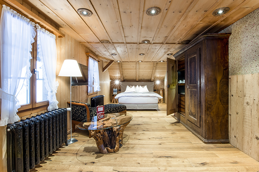 Der Furggegipfel (30 m2) verfügt über ein Deluxe-Boxspringbett von Schramm (160 x 200 cm), ein offenes Badezimmer mit Design-Badewanne, Haartrockner, Telefon, Radio/TV, Nespresso-Kaffeemaschine und Internetzugang. Das Zimmer befindet sich im dritten Stock, der Lift geht bis in den zweiten Stock.