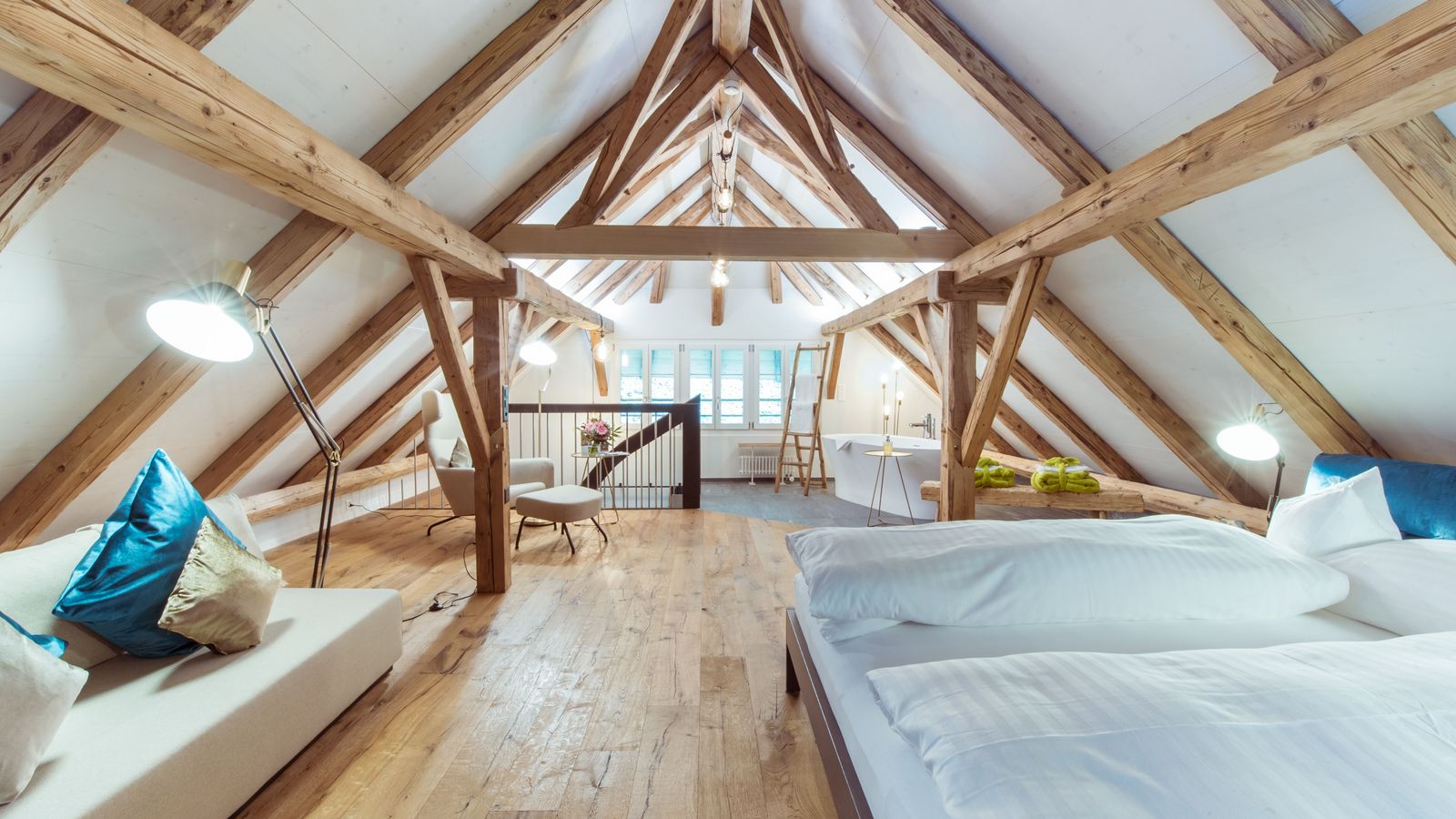 Die Wellness-Suite befindet sich im Erdgeschoss. Sie verfügt über einen Eingangs- und Wohnbereich mit Sitzgelegenheiten, sowie einen Schlafbereich mit einem Treca Boxspringbett Adonis von Betten Thaler (180x200cm), wo sich zusätzlich eine freistehende Badewanne befindet. Eingebettet in eine Nische ist das Highlight des Zimmers die grosszügige, finnische Sauna mit angrenzender Regenwalddusche.