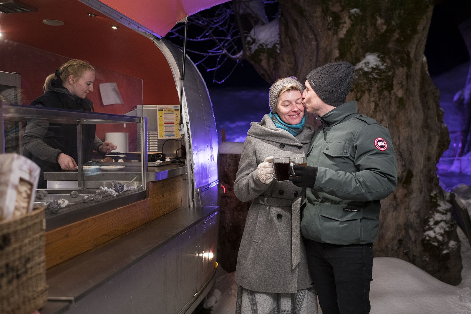 Geniessen Sie in der lichterfüllten Iglu-Landschaft Glutschtiges vom Foodtruck, die winterlichen Getränke verleihen Ihrem Besuch den perfekten Schliff!