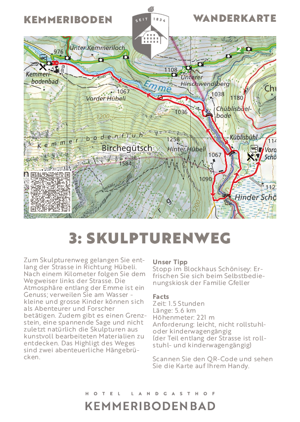 Im Tal hinter dem Kemmeriboden-Bad verbinden die zwei abenteuerlichen Hängebrücken die beiden Uferseiten der Emme miteinander. Der gemütliche Rundweg entlang des skulpturenweges zum Blockhaus Schönisey und zurück bietet ein einzigartiges Erlebnis für Gross und Klein – sei es beim entspannten Spaziergang, beim Staunen über die Aussicht oder beim Entdecken der Stahlkonstruktion. In jeder Jahreszeit eröffnen die Hängebrücken neue Perspektiven auf die Umgebung und machen den Besuch im Kemmeriboden-Bad zu einem unvergesslichen Ausflugserlebnis.