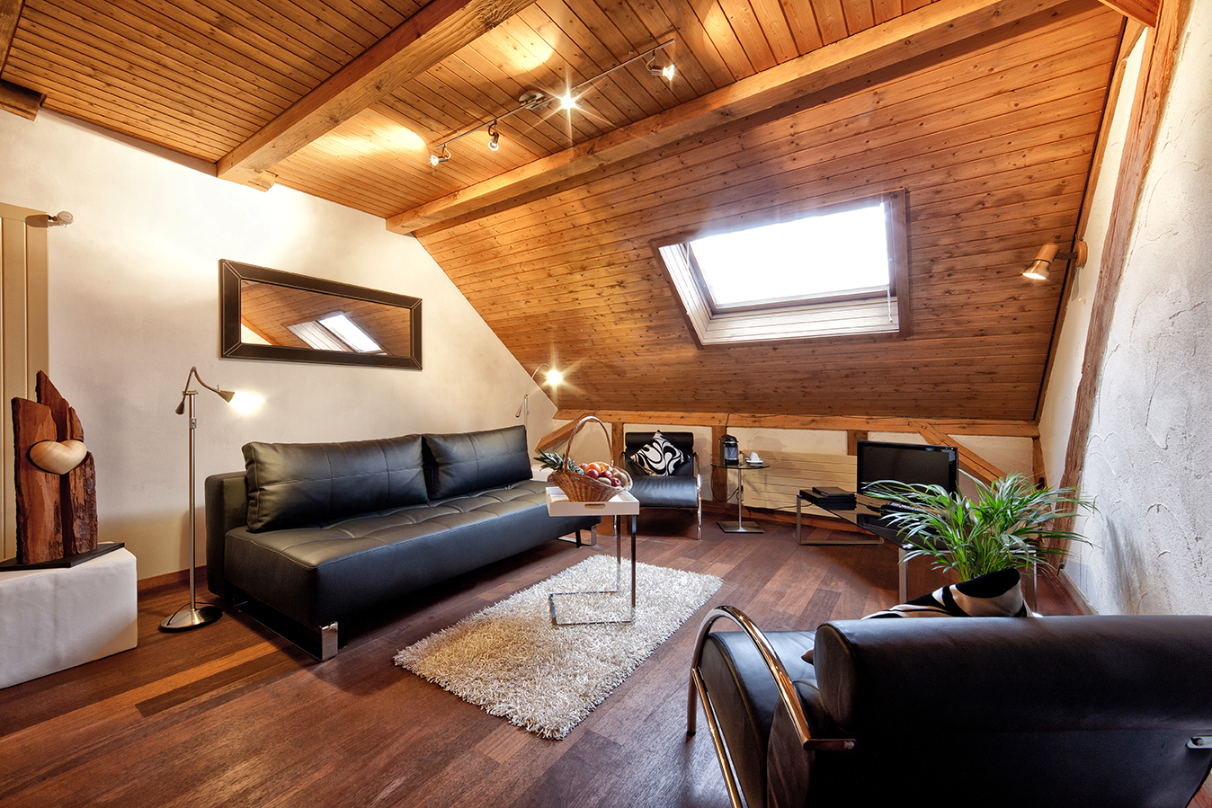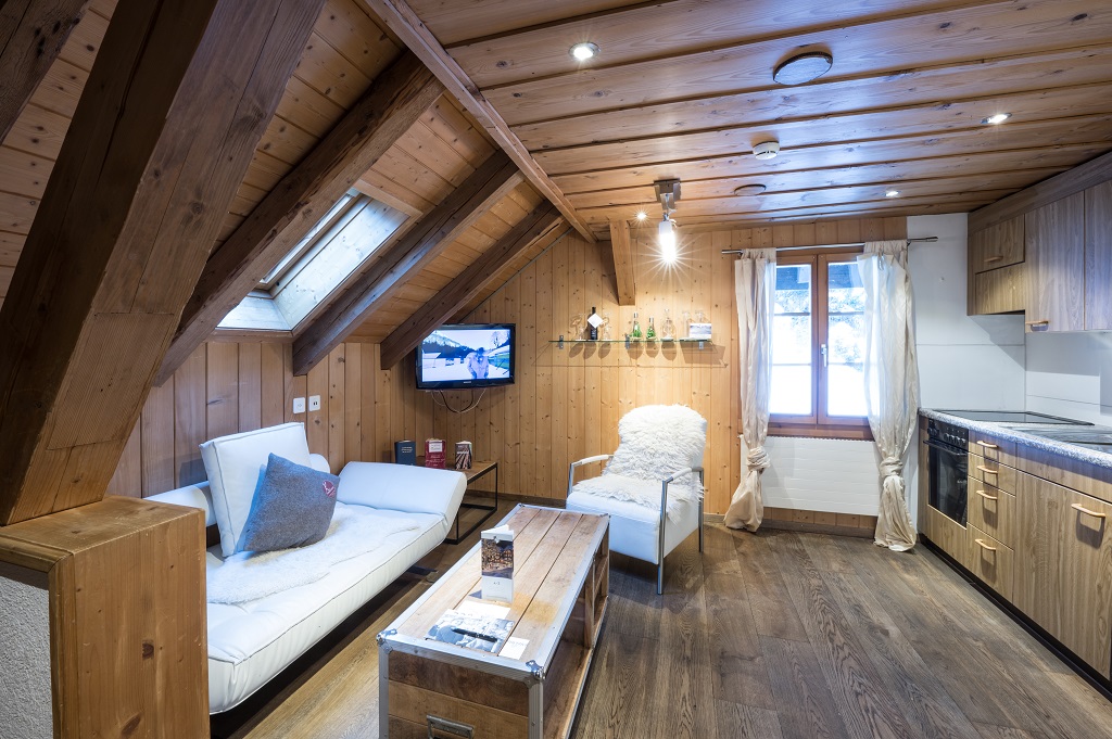 Der stilvolle Wohnbereich lädt mit einer gemütlichen Sitzecke zum Verweilen ein und ist mit einer Teebar inklusive Nespresso-Kaffeemaschine sowie einem grossen Esstisch ausgestattet. Zwei Sofas können bei Bedarf als Schlafmöglichkeiten für Kinder genutzt werden.