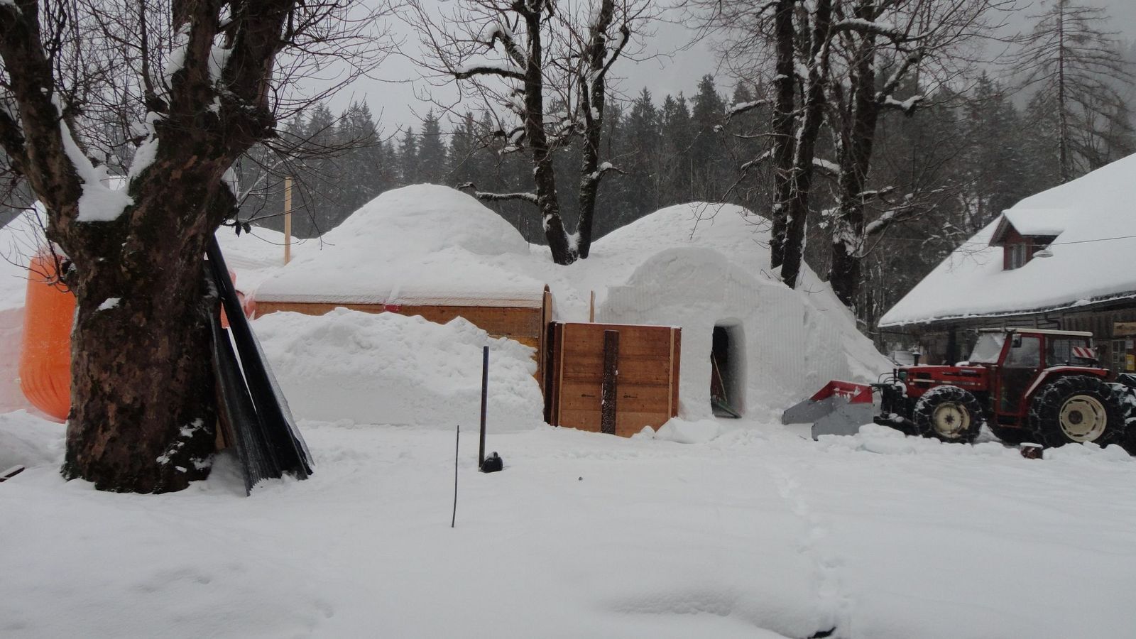 Mit viel Fleiss beginnen anfangs Dezember, je nach Schneeverhältnissen auch früher oder etwas später, die Bauarbeiten. Es wird gebuddelt, geschaufelt und Schnee rausgetragen, gesägt, geformt und gespitzt etc. Es ist jedes Jahr wieder „äs Bitzeli ä Chrampf“, aber wohl selten sieht man die getane Arbeit so gut, wie wenn das Iglu schlussendlich in voller Pracht strahlt und all unseren Gästen, ob Gross oder Klein, Jung oder Alt, viel Freude bereitet. Und immer ist der Schmerz im März gross, wenn das Iglu schmilzt und wir es schliesslich abbauen müssen.